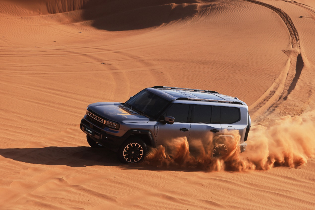 En dunas y terrenos tipo “joroba de camello”, los tres diferenciales distribuyen la potencia con precisión, permitiendo que el vehículo se recupere fácilmente incluso cuando una rueda queda enterrada en la arena. En pruebas de derrape en arena desde parado, el amplio torque permite giros ágiles, mientras que la estructura body-on-frame aporta gran rigidez. Cuando el vehículo queda en el aire, la suspensión neumática absorbe el impacto y reduce significativamente las vibraciones. En pendientes pronunciadas, el sistema HDC de control de descenso mantiene una velocidad estable incluso bajo condiciones extremas.